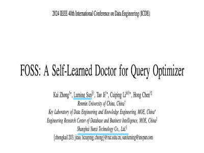 近期,KaiwuDB 与中国人民大学合作的论文 FOSS: A Self-Learned Doctor for Query Optimizer 被数据库领域顶会The 40th IEEE International Conference on Data Engineering (ICDE 2024) 录用。论文中提出了具备自学习、自诊断能力的查询优化器 FOSS,有助于了基于 AI 算法的学习型查询优化技术创新开展。KaiwuDB 高级研发工程师、人大信息学院博士孙路明为共同作者。